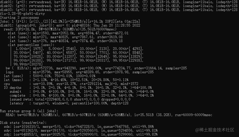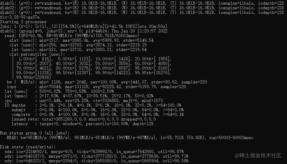 下面是经过多线程优化的fio成绩,IOPS 60.9K