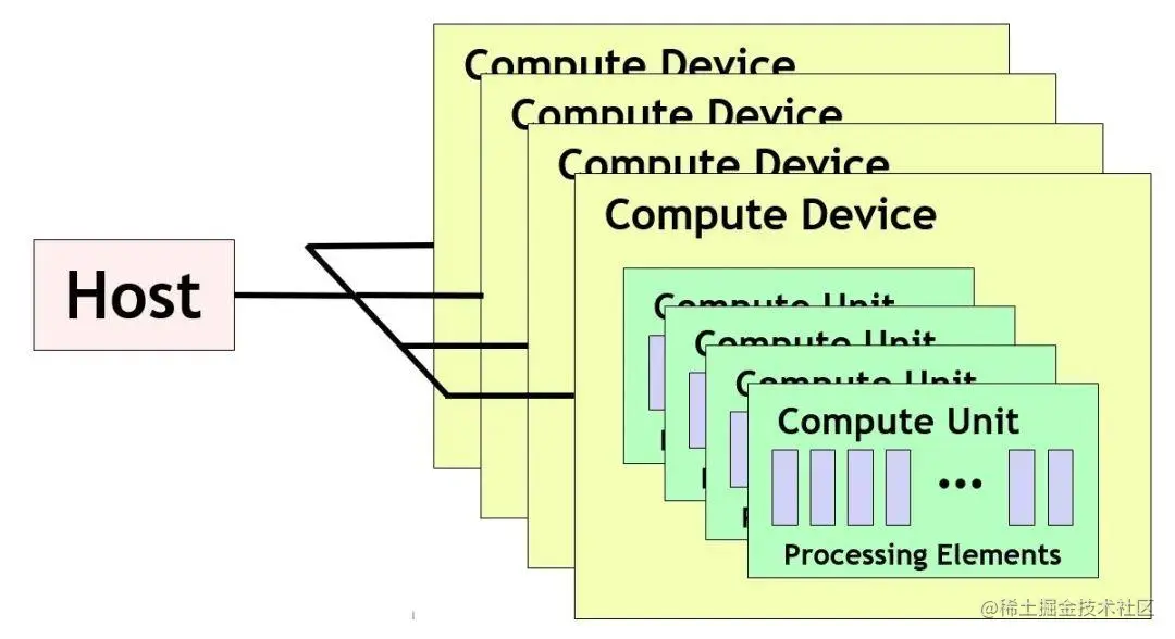 Platform 代表 OpenCL 视角上的系统中各计算资源之间的拓扑联系。对于 Android 设备,Host 即是 CPU。每个 GPU 计算设备(Compute Device)均包含了多个计算单元(Compute Unit),每个计算单元包含多个处理元素(Processing Element)。对于 GPU 而言,计算单元和处理元素就是 GPU 内的流式多处理器。