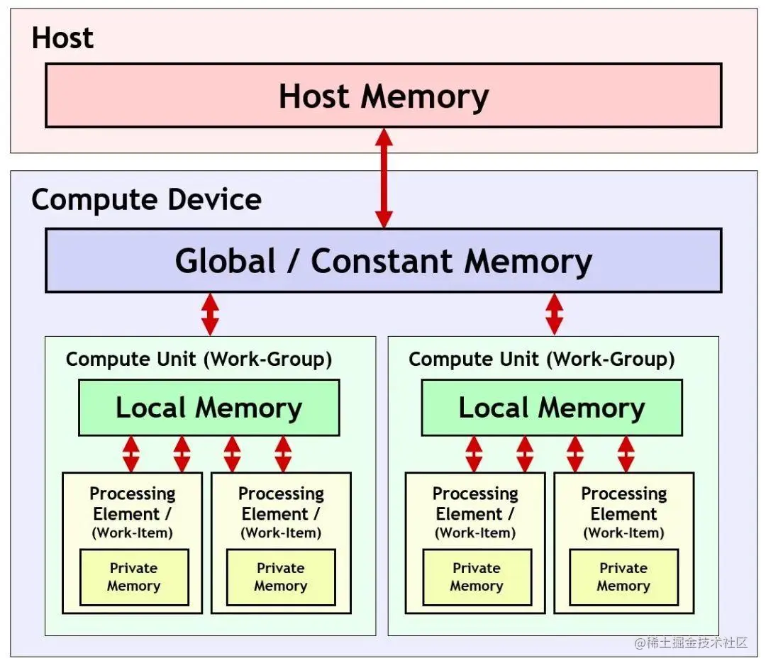 - 本地内存(Local Memory):对计算单元中的所有处理元素可用。