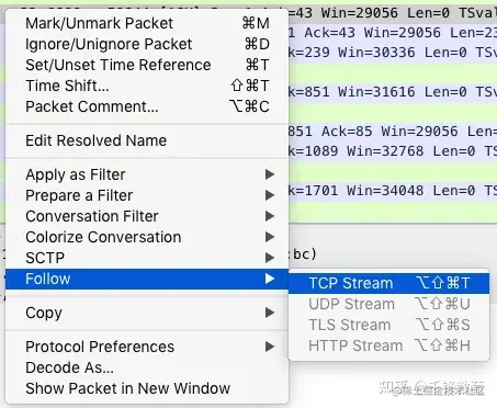 由于网络包的数量很多,我们可以先过滤一下。例如,选中一个包后,可以右键选择 “Follow”->“TCP Stream”,如下图: