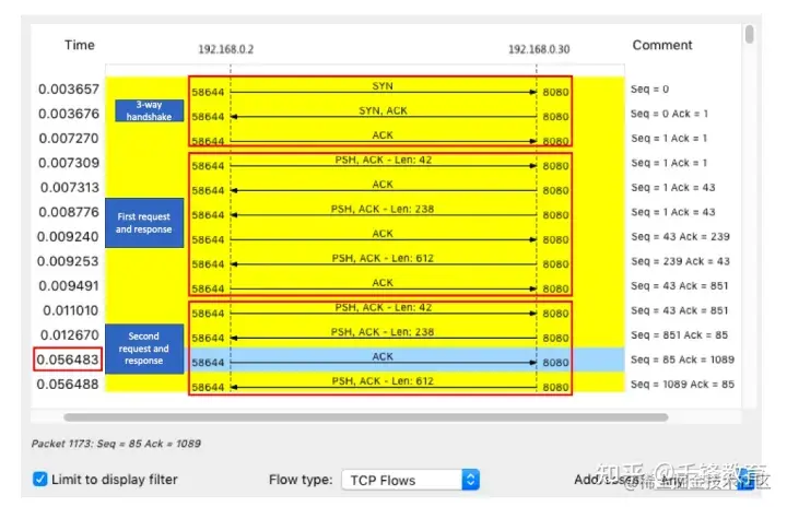从这里,您可以看到从三次握手开始,此 TCP 连接的每个请求和响应。当然,这可能不够直观,可以继续点击菜单栏中的 Statistics -> Flow Graph,选择 “Limit to display filter”,将 Flow type 设置为 “TCP Flows”:
