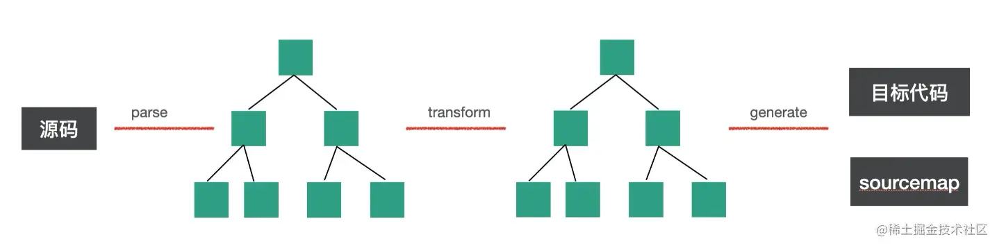 - @babel/generate 打印 AST,生成目标代码和 sorucemap,对应 generate 阶段