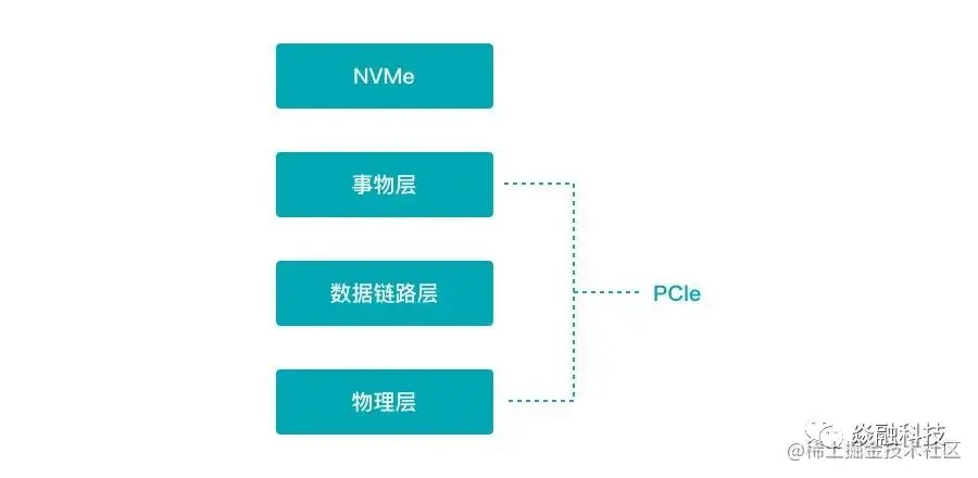 NVMe 即 Non-Volatile Memory Express,是非易失性存储器标准,是在 PCIe 接口之上的协议标准,在协议栈中隶属高层。如下图所示: