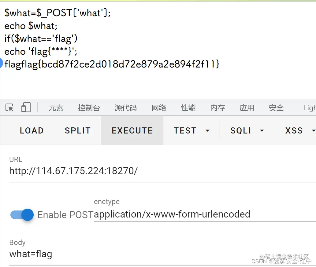 正常就是通过post传递一个what=flag的参数进去,可以通过hackbar来实现