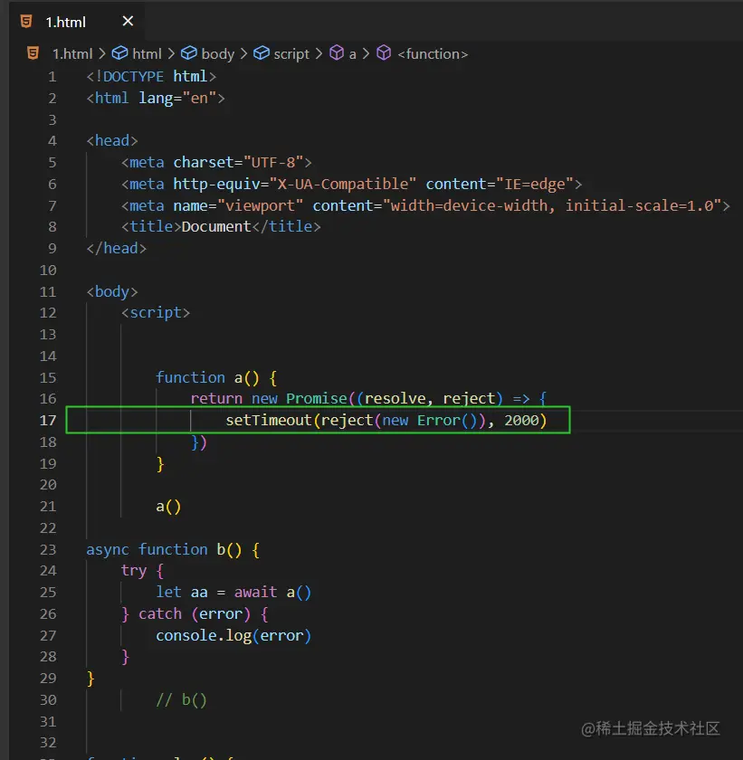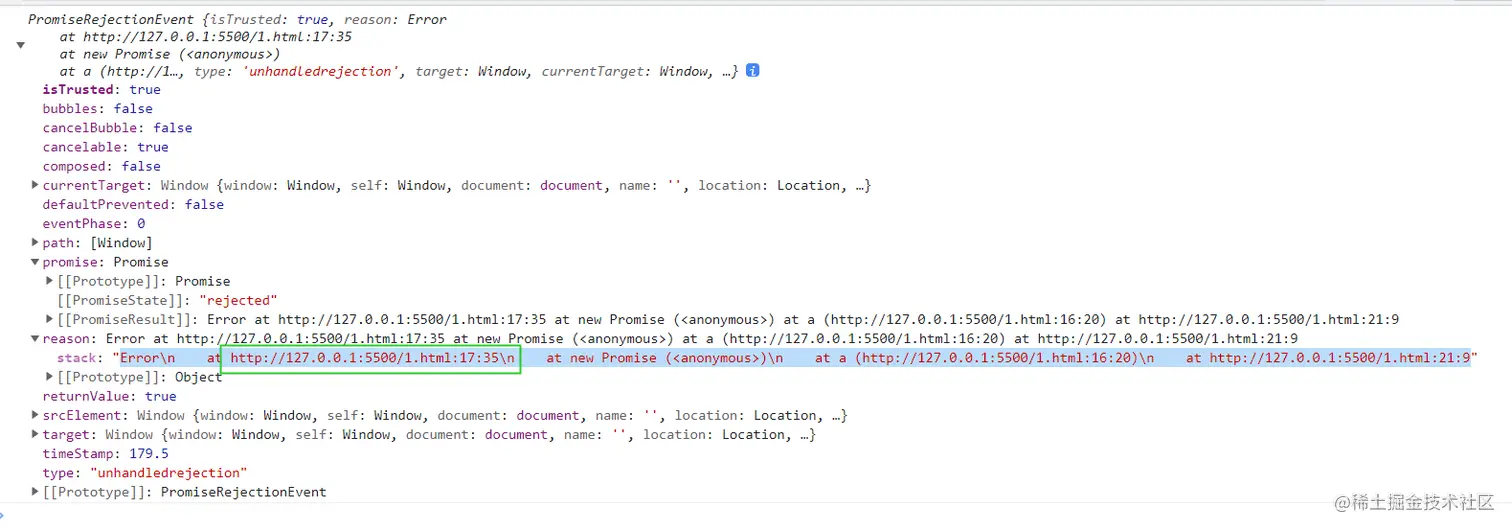 我们可以通过reason的信息查找到对应的失败Promise的位置, reason显示报错位置是17行,对应的正好是我们返回失败的Promise的位置!