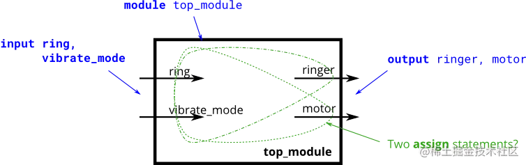 问题: 假设你正在设计一个电路来控制手机的振铃器和振动电机。当手机来电时(input ring),电路必须把震动( output motor = 1 )或响铃( output ringer = 1 )打开,但不能同时打开。当手机处于震动模式时( input vibrate = 1 ),则打开震动( output motor = 1 )。否则打开响铃。