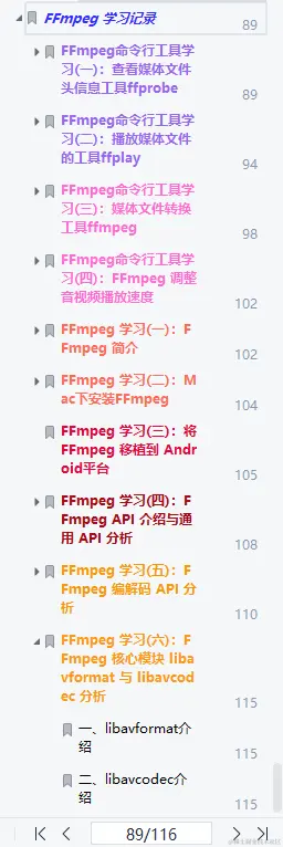 当然音视频开发中,不止FFmpeg这一个块技术点;还有许多比较深入学习的技术。比喻:H265、H264、MediaCodec、Media内核源码等等核心技术点,这些技术点独一整理成立出一个文档。