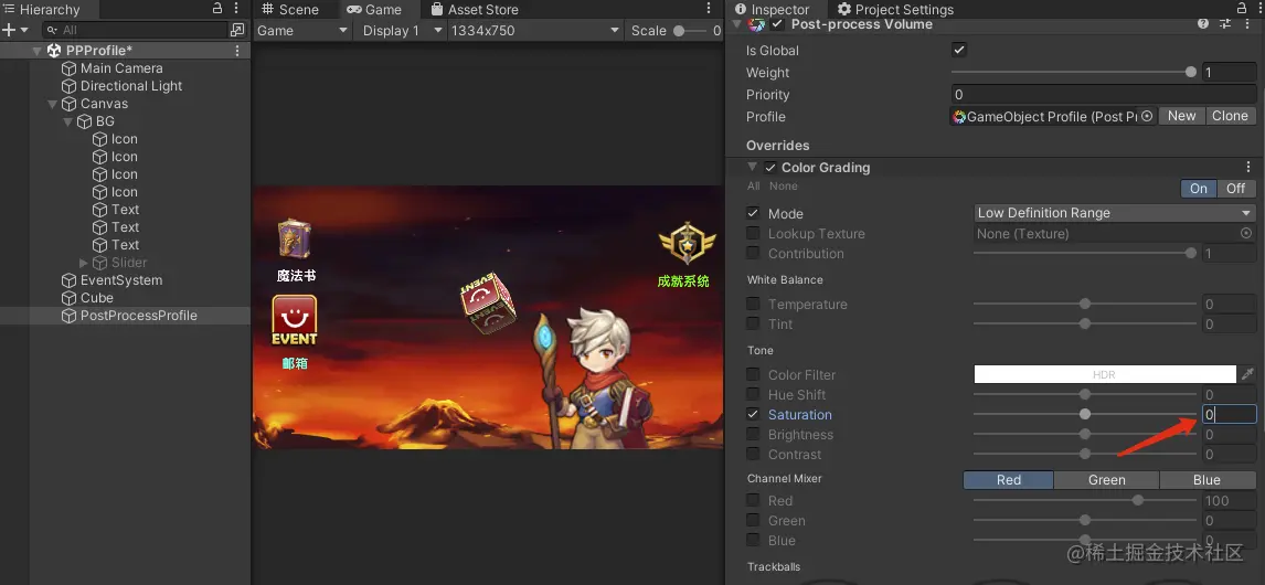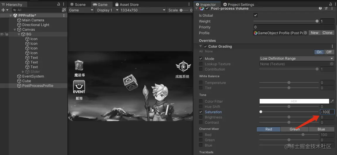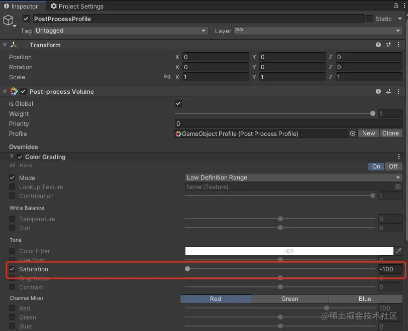我这里创建了一个Slider,来动态控制Saturation 饱和度的值。创建代码命名为PostProcessingProfile 将其挂载到场景中PostProcessProfile的物体上,就可以实现开篇看到的滑动条控制灰度效果了: