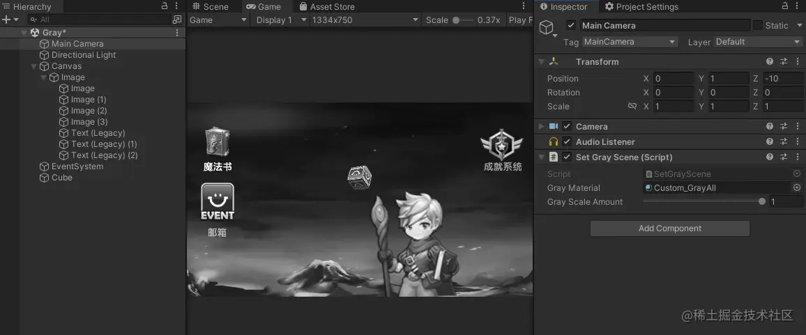 创建代码SetGrayScene,并将其挂载到摄像机上,通过2.1中介绍的OnRenderImage和Graphics.Blit实现,具体代码如下: