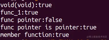 std::cout << "func pointer is pointer:" << std::is_pointer<decltype(func_point)>::value << std::endl;