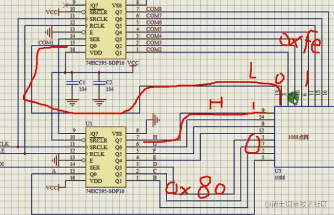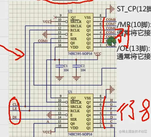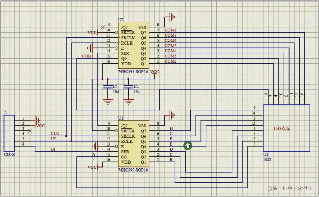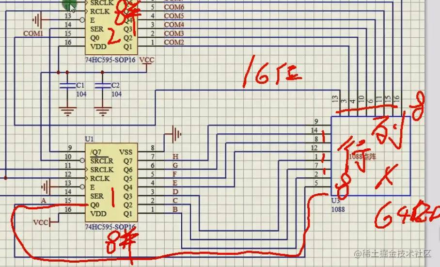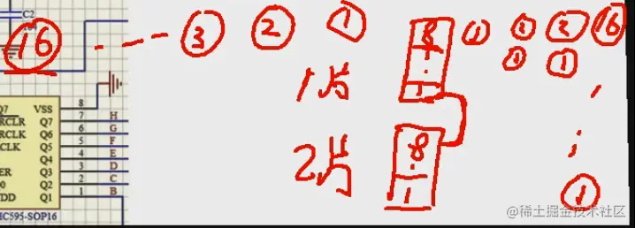 为什么要级联?595是串入并出,8个IO口作并行输出,我们点阵有16个脚,1片只能控制8个脚,还有8个脚我们就再需要一片。