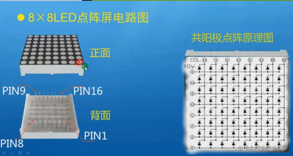 8*8就是8行8列的64个的点阵屏,左下方那是背面引脚图,在设计点阵屏的时候就需要了解这个引脚是怎么排序的,否则怎么驱动它。