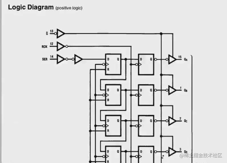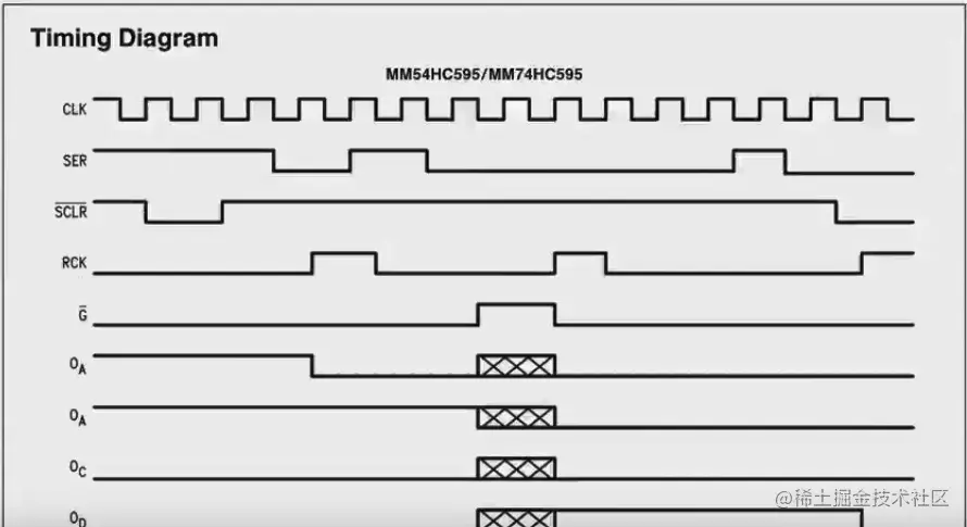 SCK位上升沿时,移位寄存器移位。RCK为上升沿就把移位寄存器内容传输到输出锁存器。