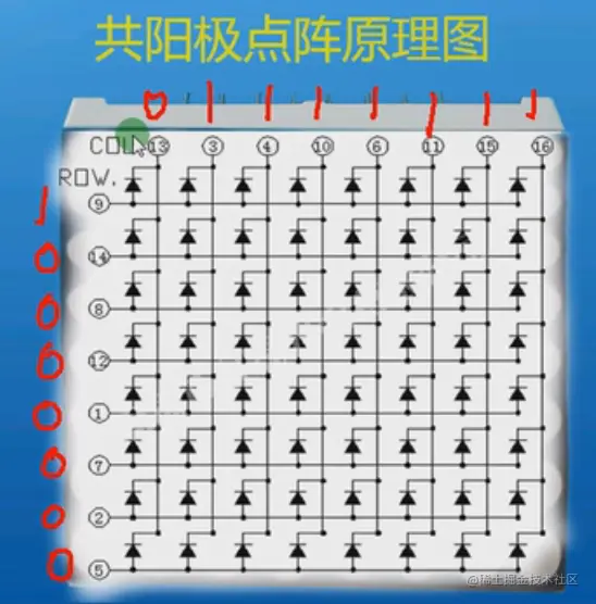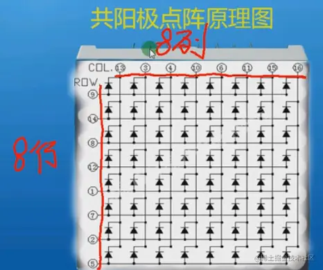 我们的LED点阵是共阳极的,和前面的数码管一样,也分为共阳极共阴极。