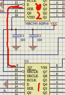两个595的时钟线(11和12脚分别接在一起)接在一起,输入端接在第一片(14),另一片的输入接在级联的输出端。电源端加上滤波电容(C1、C2)。
