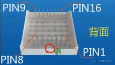 看这有一个凹起的塑料,以这个点为参考点,右面是1脚,左边是8脚,右到左1~8,上方左到右是9~16。学会后要是自己想做一个点阵屏就要知道引脚的排序。