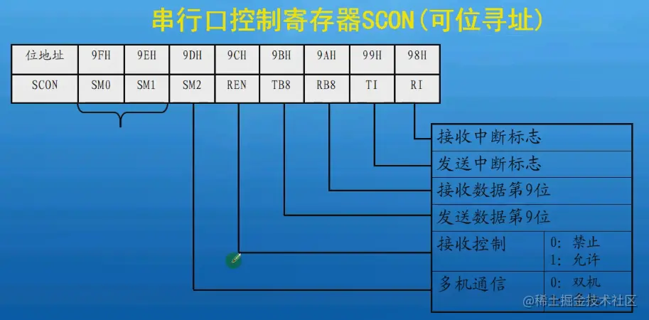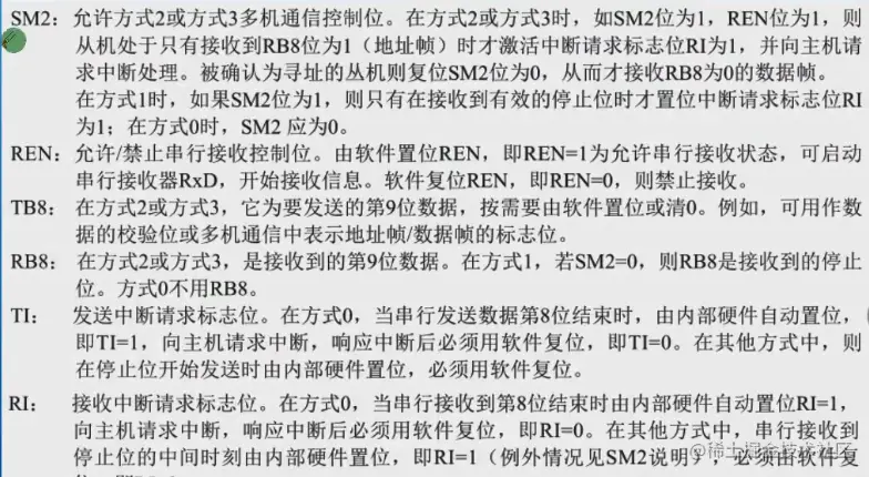 SM0和SM1是工作方式的设置。SM2是多机通信的。REN是接收控制。TB8和RB8是第九位。TI和RI是发送和接收中断标志位,发送完和接收完会被置1。
