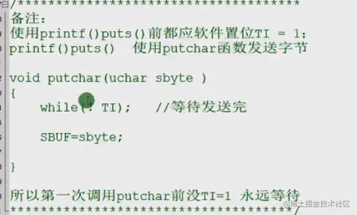 puts()上面为什么TI=1,因为我们给SBUF送值后,串口会自动发送,发送完,硬件置1,我们为什么用软件置1?