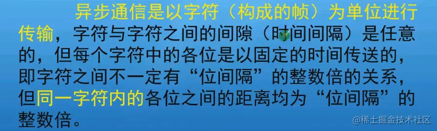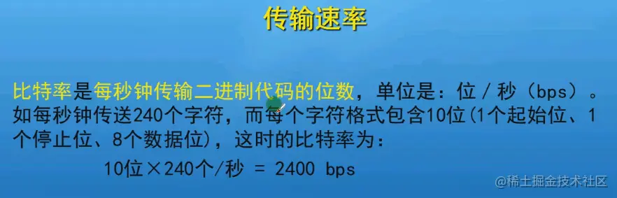 这是指异步通信的传输速率。每帧数据的间隔是任意的,但是每位是固定的,这个时间是由传输速率的比特率决定的。