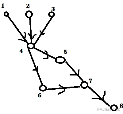 在这张图中,点1,2,3是没有点指向它们的,因此它们三的入度为0,