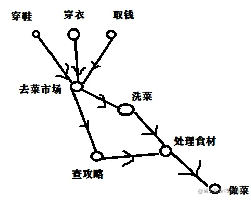 在这张DAG图中,边的实际意思是事件的依赖关系,即要做下一件事时,要先把前置的事件做完。