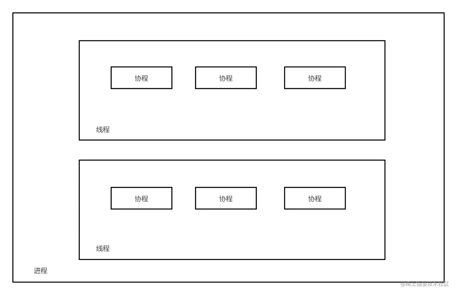 在 Rust 中主要应用的是 进程—线程—协程 异步模型,如下所示:
