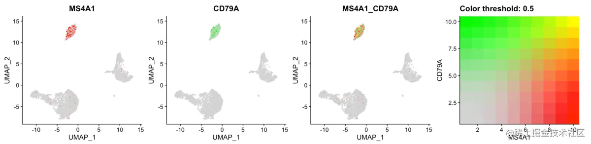 FeaturePlot(pbmc, features = c("MS4A1", "CD79A"), blend = TRUE)