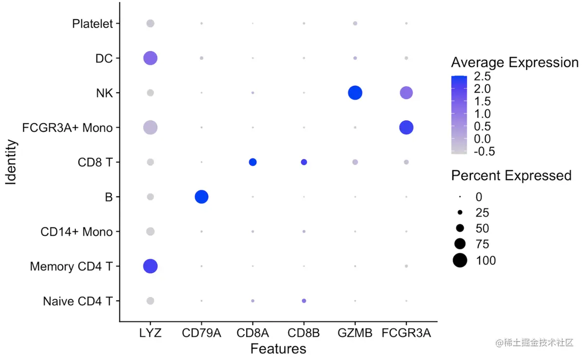 genelist = c('LYZ','CD79A','CD8A','CD8B','GZMB','FCGR3A')