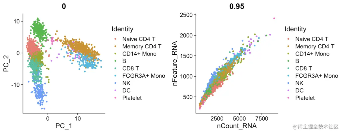 FeatureScatter还可以用来查看所有细胞或某个细胞中两个基因的相关性