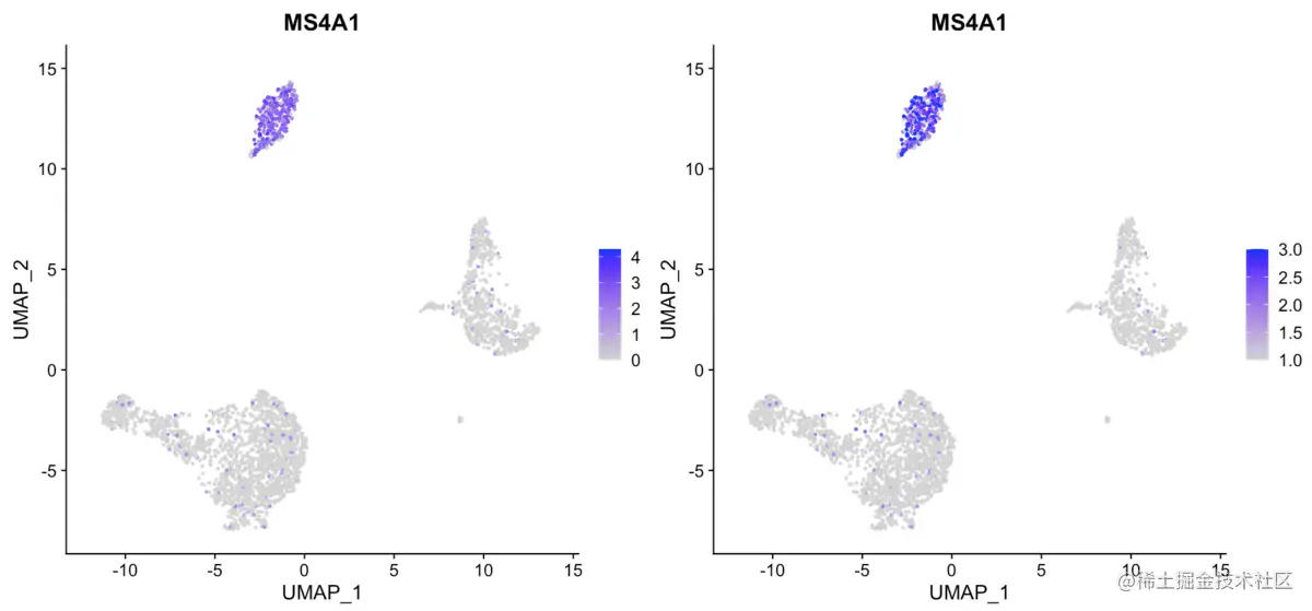 p2=FeaturePlot(pbmc, features = "MS4A1", min.cutoff = 1, max.cutoff = 3)