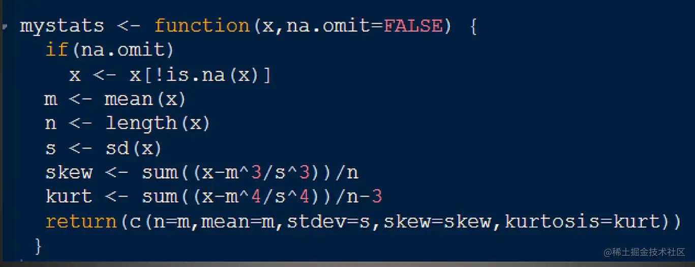 第一个选项参数x就是要计算的数据,是一个数值向量,第二个选项是na.omit,用于删除缺失值,默认取值为False,然后是大括号,用于写函数的主体