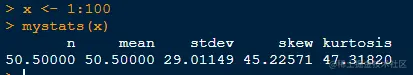 return(c(n=m,mean=n,stdev=s,skew=skew,kurtosis=kurt))}