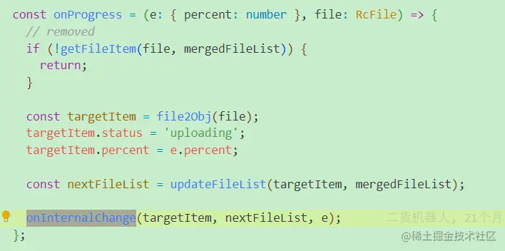 然后,我们会找到onProgress 这个方法,在这个方法中,我们会看到,onInternalChange 这个方法会接收event对象,所以,我们还需要接着向上查找。最终我们发现,onProgress 这个方法会连带着其他参数和方法一起传给RcUpload 组件,所以,我们需要去寻找RcUpload 组件的源码,看最终这个方法是如何执行的。