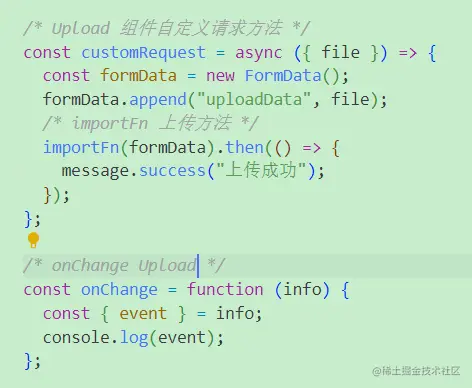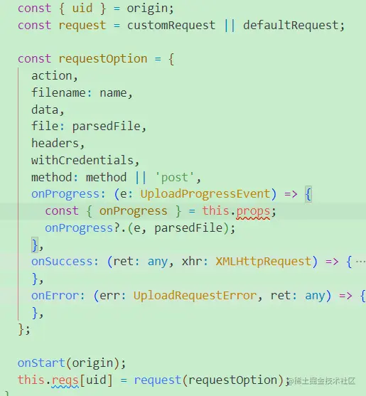 在源码中,我们可以看到,onProgress 这个方法,会放在requestOption 这个对象里面,然后传递给customRequest || defaultRequest ,那么,至此,就可以很明显的看出来,为什么在Upload 组件onChange 方法中,无法拿到event 对象了,因为我这边是使用的customRequest,在customRequest中,并没有调用requestOption.onProgress 方法,所以我们在之前的代码中无法从onChange中拿到event。