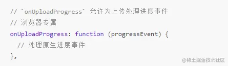 通过查找Api文档我们可以发现,onUploadProgress 这个方法可以获取上传信息,所以,我们在发送请求的时候,将这个属性方法给配置上去,就可以用来处理对应的文件上传信息。