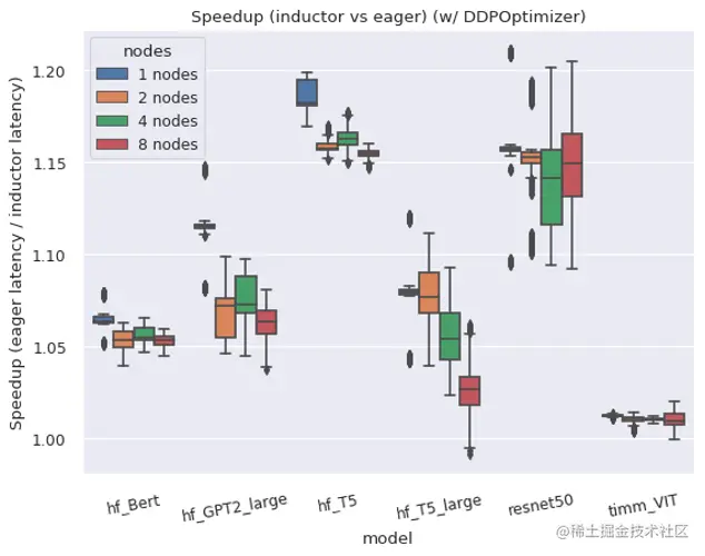 DDP 的效率提升依赖于反向传播计算与 AllReduce 通信的重叠,并将较小的逐层 AllReduce 操作分组到“桶”中。TorchDynamo 编译的 AOTAutograd 函数在与 DDP 简单结合时阻碍了通信重叠;但通过为每个“桶”编译单独的子图,并允许通信操作发生在子图外部和子图之间,性能得以恢复。编译模式下的 DDP 支持目前还需要static_graph=True和find_unused_parameters=True,但这些不会是长期要求。有关 DDP + TorchDynamo 的方法和结果的更多详细信息,请参阅这篇文章。