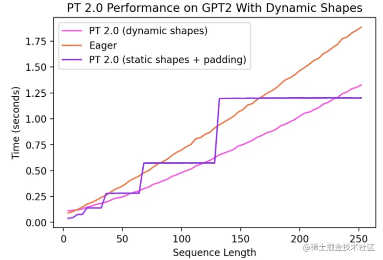 在查看支持 PyTorch 代码通用性的必要条件时,一个关键要求是支持动态形状,并允许模型采用不同大小的张量,而无需在每次形状更改时重新编译。 截至今天,对动态形状的支持是有限的,并且正在快速进行中。它将在稳定版本中具有完整的功能。你可以设置 dynamic=True 以启用它。在特征分支(symbolic-shapes)上我们取得了更多进展,我们已经在使用 TorchInductor 的完整符号形状训练中成功运行 BERT_pytorch。对于动态形状的推理,我们有更多的覆盖面。例如,让我们看一下常见的动态形状发挥作用的场景——使用语言模型生成文本。 我们可以看到,即使形状从 4 一直动态变化到 256,编译模式也能够始终优于 eager 高达 40%。在不支持动态形状的情况下,常见的解决方法是填充到最接近的 2 的幂。但是,正如我们从下表中看到的那样,它会产生大量的性能开销,并且还会导致编译时间显著延长。此外,填充有时并不容易正确执行。 通过在 PyTorch 2.0 的编译模式中支持动态形状,我们可以获得最佳的性能和易用性。
