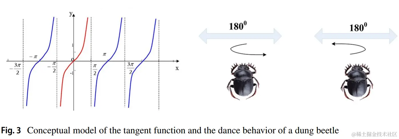 为了模拟舞蹈行为,作者使用正切函数(只考虑[0,π]区间内的值)得到新的滚动方向。 一旦蜣螂成功地确定了一个新的方向,它应该继续向后滚动球。因此,蜣螂的位置按如下更新: