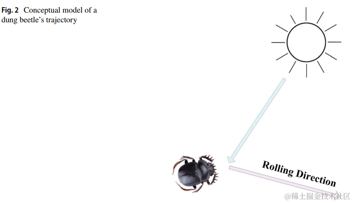 根据上面的描述,我们知道蜣螂在滚动过程中需要通过天体线索来导航,以保持粪球在直线上滚动。为了模拟滚动球的行为,需要蜣螂在整个搜索空间中沿着给定的方向移动。如下图所示,可以看出,蜣螂利用太阳导航,红色箭头表示滚动方向。