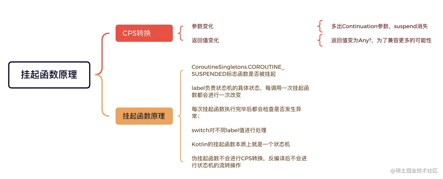 挂起函数中的CPS转换就是把挂起函数转换成一个带有Callback的函数,这里的 Callback 就是 Continuation 接口。在这个过程中会发生函数参数的变化和函数返回值的变化。