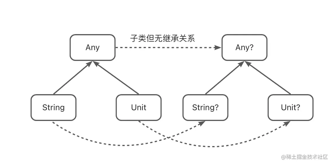 Kotlin中的Any类似于Java中的Object,Any是不可为空的,Any?是可以为空的,Any?包含Any的同时还包含了可空的类型,也就是说后者的包容性比前者更广,所以说前者就是后者的子类,同样的String和String?、Unit和Unit?也是一样的关系,用图表示就是这样