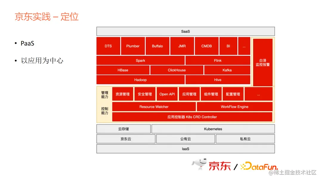 首先我们要定位。定位是一个PaaS层,但PaaS层是在Kubernetes的基础之上去提供一些能力,包括资源、安全、API、应用组件配置等一系列管理能力,也包括控制能力。为什么单独讲控制能力呢?因为我们做的方式跟社区的Operator逻辑一致,但又有些不同,我们把它抽象成一个统一的模型来做,而不是每个产品都做一个Operator。
