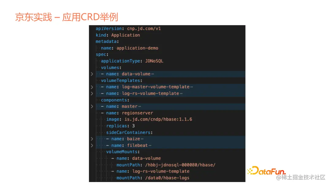 我们定义为cnp,我们内部的一个Cloud Native Platform,在这个Application里面我们可以看到它的volumes的定义,这个volumes跟Kubernetes里面的volumes不太相同,里面更多是具体的PVC的关联声明。Volumes template是我们自己独创的一个概念,在这个模板里面,可以定义这个模板如何声明,为每个Pod声明出自己对应的volume。在每个Application里面有多个Components,我们这个components是一个抽象的逻辑概念。在Application里面分成多个Components,每个component可以有自己的定义。这个是对于HBase而言的,分成Master和Region Server。这里我们特意加了一系列的Sidecar containers,这是我们平台提供的一个特性,里面提供一些监控或日志的能力。每个Sidecar会在Application里面根据Portal取得它的定义和选择,把Sidecar定义进来。