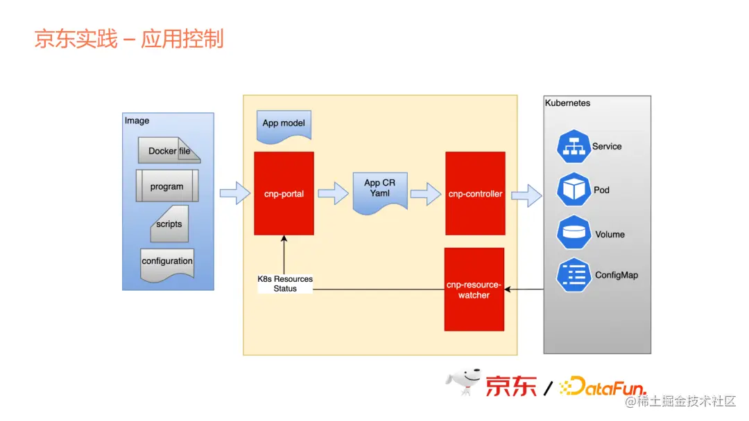 上图中可以看到我们有几个主要的组件,一个是Portal,这部分是我们的管控台,在这个管控台里面去定义上文中说的应用。从组件开始定义,组件里面又包含了各个组件的配置文件、组件的镜像image、一些动态配置,哪些配置项可以动态生成,在组件或者应用创建时,需要动态输入。