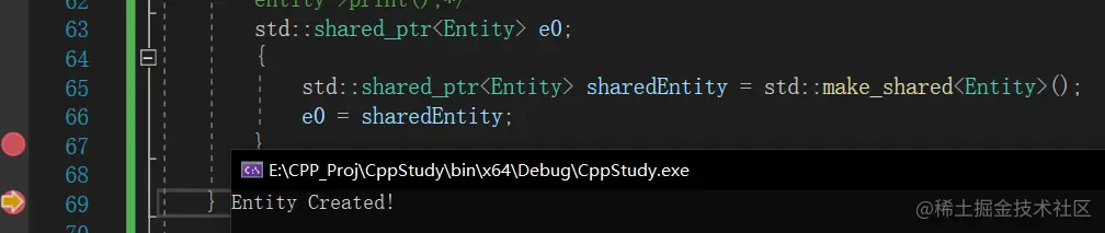 }//此时尽管已经越出该作用域(scope)但是cpp不会销毁该指针,因为sharedEntity赋值给了e0,此时refenrence count不为0
