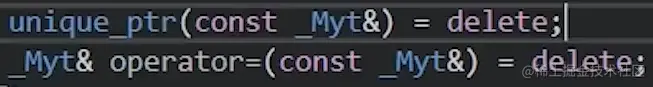 unique_ptr源代码中,通过运算符重载的方式删除了=符号。同时将unique_ptr的copy constructer也给delete