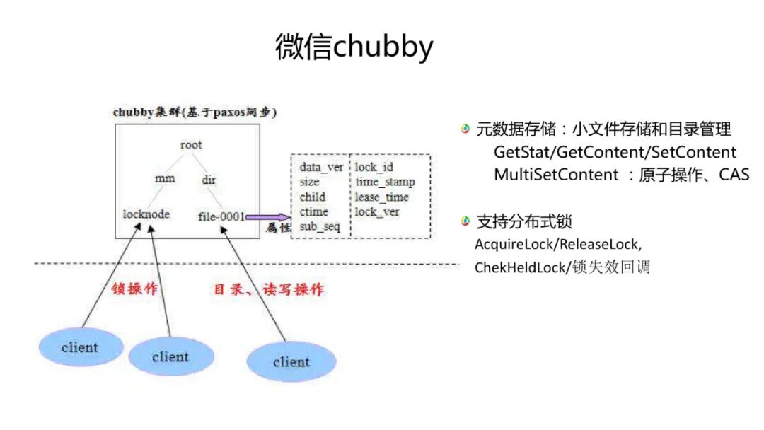Chubby是Google一个论文提到的系统,微信技术团队延伸了这样一个逻辑,基本上跟它的接口是一样的。