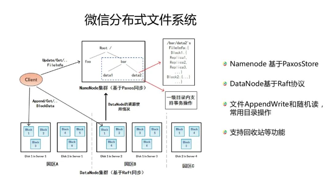 微信分布式文件系统Namenode 基于PaxosStore,DataNode基于Raft协议。Raft是基于租约机制的完美实现。基于Raft我们可以做到DataNode的强一致写。另外,它支持文件AppendWrite和随机读以及文件回收等功能。