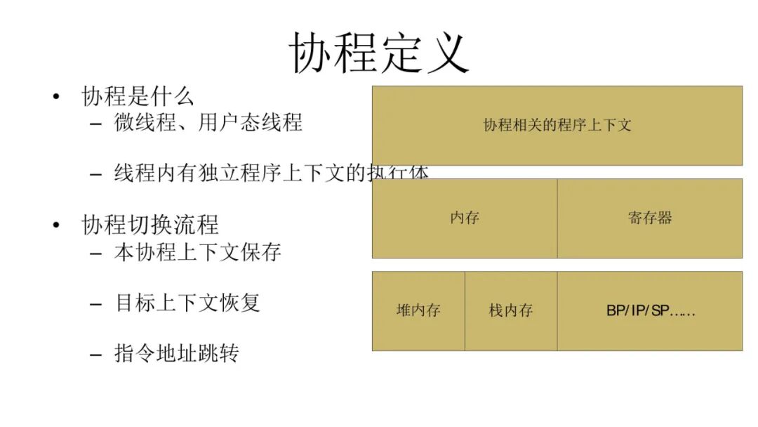 协程到底是什么?可以说它是微线程,也可以说它是用户态线程。协程切换流程其实不复杂,它主要任务是把上下文保存起来。上下文只有两个部分,第一部分是内存和寄存器,第二部分是栈的状态。