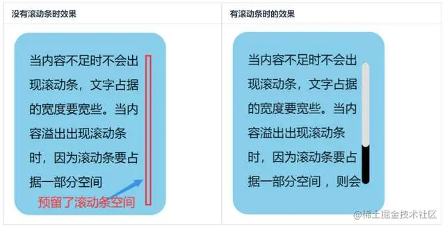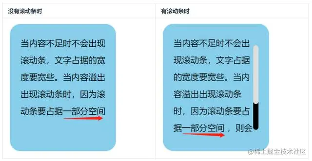 当内容不足时不会出现滚动条,文字占据的宽度要宽些。当内容溢出出现滚动条时,因为滚动条要占据一部分空间,则会造成文字占据的空间变窄,因而会造成重排。